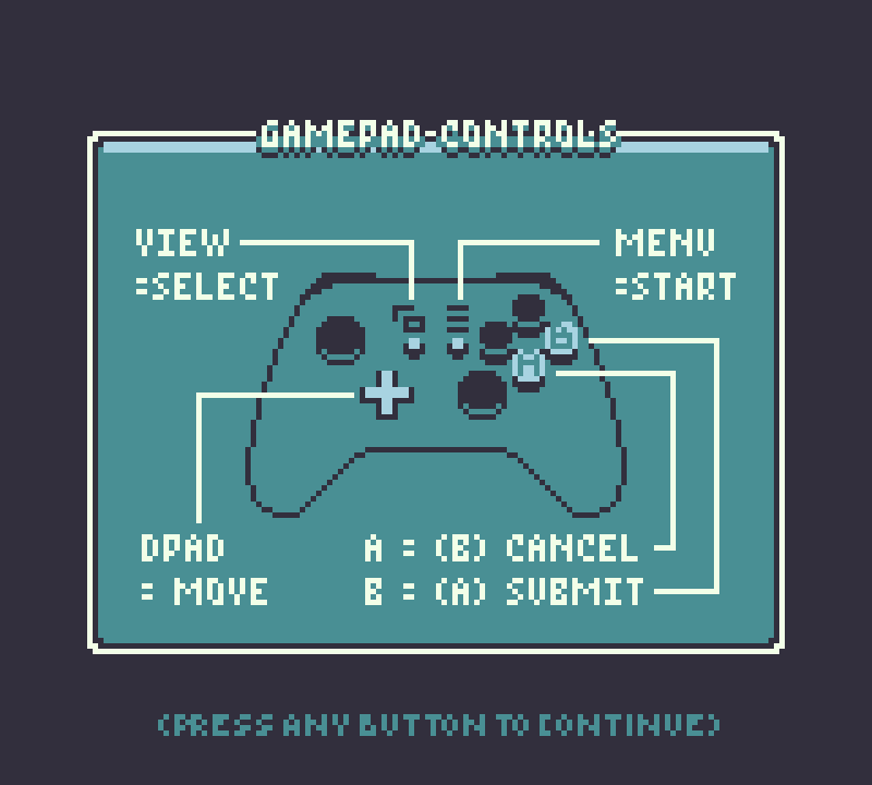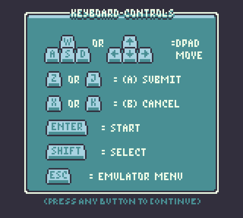 For the web build and exe emulator, arrow keys or WASD are "D-pad", Z or J keys are "A", and X or K keys are "B", Enter is "Start", Shift is "Select".